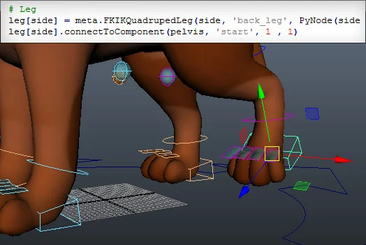 All scripted components added to the meta-rigging library are modular and can be integrated into rigs of future productions with ease; only one or two lines of code are required to invoke their functionality